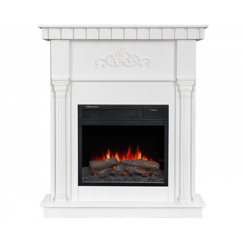 Белоснежный каминный портал украшен декоративным орнаментом выполненном в греческом стиле. Прямые строгие линии в сочетании с шикарный цветом, делают этот небольшой электрокамин и простым, и торжественным.